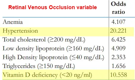 The mean serum vitamin D levels seen in RVO patients and the control group were 14.19 ± 5.23 ng/ml and 19.42 ± 10.27 ng/ml, respectively (P value = 0.001) with an odds ratio of 10.558 (CI = 2.34–47.50), indicating vitamin D deficiency to be strongly correlated with RVO. Maximum patients of RVO (46.3%) were seen during the winter season. The study noted hypertension [odds ratio 20.22 (CI = 5.812–70.347)], dyslipidemia, and anemia [odds ratio 4.107 (CI = 0.62–26.90)] to be the risk factors for RVO as previously proved in the literature. Smoking, diabetes, alcohol intake, and body mass index did not emerge as risk factors for RVO.