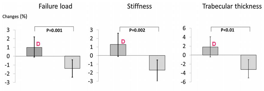 Vitamin D3 increased trabecular vBMD (QCT scans) in the trochanter region (0.4 vs. − 0.7 g/cm3) and the femoral neck (2.1 vs. − 1.8 g/cm3) pall < 0.05. HRpQCT scans of the distal tibia showed reduced trabecular number (− 0.03 vs. 0.05 mm−1) and increased trabecular thickness (0.001 vs. − 0.005 mm), as well as an improved estimated bone strength as assessed by failure load (0.1 vs. − 0.1 kN), and stiffness (2.3 vs. − 3.1 kN/mm pall ≤ 0.01).