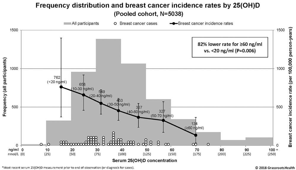 Breast cancer risk markedly lower with serum 25-hydroxyvitamin D concentrations >60 vs <20 ng/ml (150 vs 50 nmol/L): Pooled analysis of two randomized trials and a prospective cohort