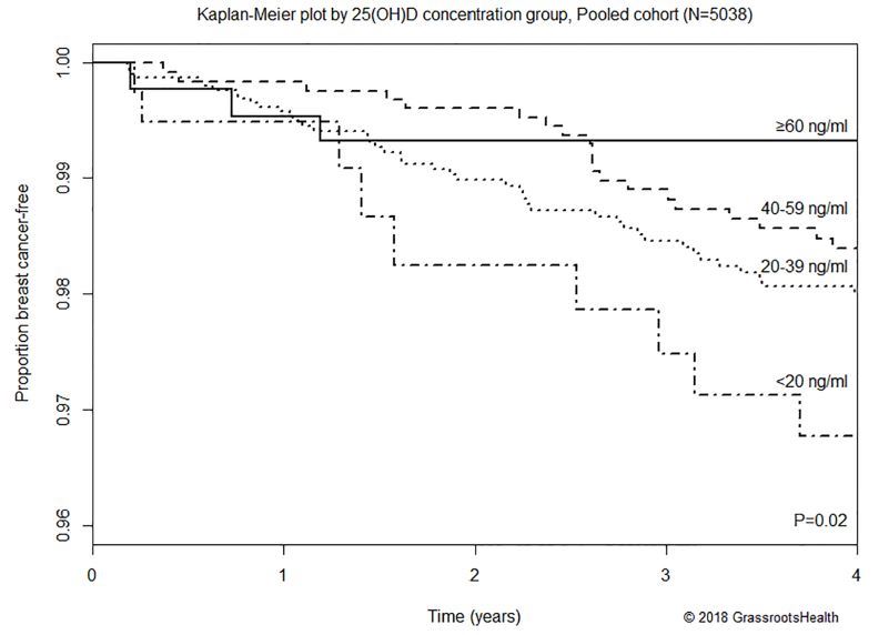 Second, Kaplan-Meier curves comparing the proportion of breast cancer-free participants by 25(OH)D group are shown in Fig 2. These curves were significantly different (P = 0.02), with the highest proportion breast cancer-free at 4 years in the >60 ng/ml group (99.3%) and the lowest proportion breast cancer-free in the <20 ng/ml group (96.8%). The proportion with breast cancer was 78% lower for >60 ng/ml vs <20 ng/ml (P = 0.02) in the Kaplan-Meier analysis.