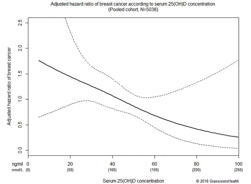 The current NAM recommendation of 20 ng/ml (50 nmol/L) is based solely on bone health [28], yet it is widely used as the target level for all health conditions. The findings from this study suggest that breast cancer incidence could be substantially reduced by increasing 25(OH)D concentrations well above 20 ng/ml (50 nmol/L). Fig 3 shows tight confidence bands from about 30 to 55 ng/ml, which represents a decrease in breast cancer risk of ~38%. The high end of that range, 55 ng/ml, falls within the 40 to 60 ng/ml range recommended by a consortium of scientists and physicians to prevent several diseases including breast cancer [29]. Serum 25(OH)D concentrations between 40-60 ng/ml (100-150 nmol/L) are within the physiological range, as evidenced by traditionally living Africans who have a mean 25(OH)D concentration of 46 ng/ml (range: 23-68) with 62% having concentrations between 40-60 ng/ ml [46]. In the range of 60 to 100 ng/ml, the downward trend continues. The widened confidence bands stem from the decreasing number of women with 25(OH)D concentrations in this upper range. Clarifying the nature of the association in this upper range should be a high priority for future investigations.
