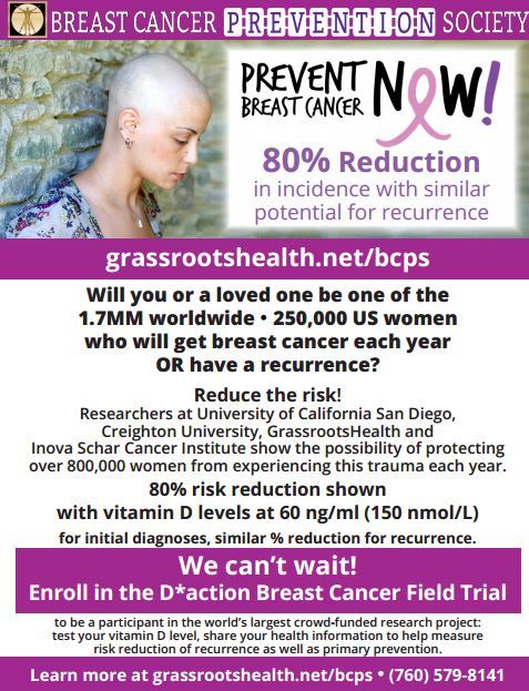 Breast Cancer 80 percent less likely if high level of vitamin D – June 2018Printer Friendly Follow this page for updates14716 visitors, last modified 07 Oct, 2020, This page is in the following categories (# of items in each category)Attached files