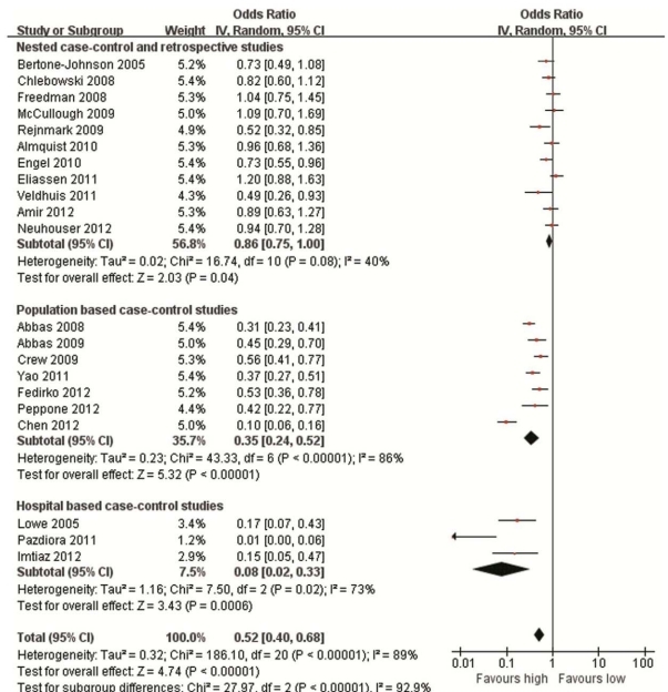 From the meta-analysis of the observational studies, we found that women with highest quantile of blood 25(OH)D level was associated with a significantly reduced breast cancer risk compared to those with lowest quantile of blood 25(OH)D level for the 11 nested case-control and retrospective studies (pooled OR = 0.86, 95% CI = 0.75-1.00) and