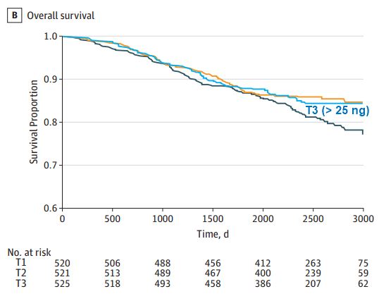 Followed for 8 years Before treatment: T1 < 17mg; T2 17-25 ng; T3 > 25 ng