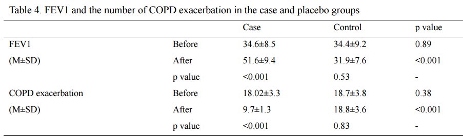In each group, there were 44 patients. After the intervention, there were significant differences in FEV1 and the number of COPD exacerbation between the case and control group patients. Also, after the study, in the case group, FEV1 was increased and the number of COPD exacerbation was decreased significantly.CONCLUSION: