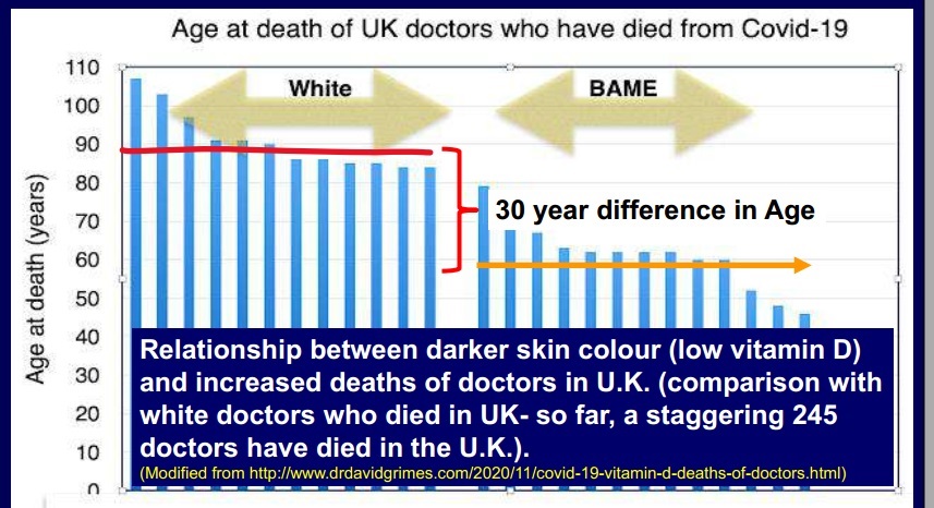 0:41:09.5 SW: This is a study by the... This is not published, but you will see in the website by Dr. David Grimes, he's a senior physician in UK, and shows the point that the effect of the people with a darker skin color, so-called BA Medium, the ethnic minority group has in this. Yes, so he used the group of doctors who died in UK because, it has unique reason for this, because they are... Whether you're white, Black, or brown, the social class is the same. They live in the same environment and their cultural and other habits are generally similar. So you're actually eliminating most of the confounders like socio-economic status, in this particular group of people. As you see, the mean death rate or mean age of the white doctors who died in UK is about 90; many of them are retired. Whereas, the mean death rate of the people with the colored skin, the death rate is about 60. So what you see is about a 30% decrease in age. So these people are dying at 30 years younger than the white counterparts. So, this increased death rates in UK compared to the white doctors who died suggests that importance of having, at least, indirectly, informed us that this is due to vitamin D... Severe vitamin D deficiency in this group of people.