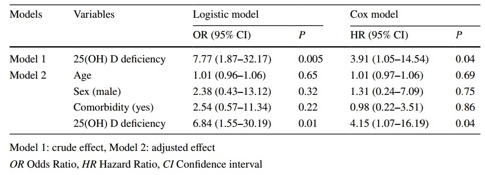 The mean age of patients was 55.18 ± 14.98 years old; 46.4% were male. Mean serum 25(OH)D concentration was significantly lower in the deceased (13.83 ± 12.53 ng/ mL compared with discharged patients (38.41 ± 18.51 ng/mL) (P < 0.001). Higher levels of 25(OH)D were associated with significantly less extent of total lung involvement (β = − 0.10, P = 0.004). In addition, vitamin D deficiency [25(OH) D < 25 ng/mL] was associated with a significant increase in the risk of mortality (hazard ratio = 4.15, P = 0.04).