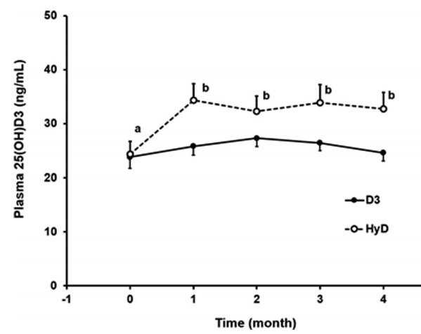 Vitamin D insufficiency is associated with various disease processes. We determined whether consumption of a diet supplemented with HyD®, a 25-hydroxycholecalciferol (25(OH)D3) source, would safely increase plasma 25(OH)D3 concentrations in Golden Retrievers with low vitamin D status. We hypothesised that dietary supplementation with HyD® would rapidly increase and sustain plasma 25(OH)D3 levels in healthy Golden Retrievers with low vitamin D status compared with supplementation with vitamin D3. Of fifty-seven privately owned dogs recruited with written owner consent, eighteen dogs with low vitamin D status were identified and sorted between two groups to have similar initial plasma 25(OH)D3 concentrations, sex distributions, ages and body weights. Dogs of each group were fed a dry dog food supplemented with either 16 μg/kg of 25(OH)D3 as HyD® (n 10) or 81 μg/kg of cholecalciferol (D3) (n 8) for 4 months. Plasma 25(OH)D3 concentrations were determined monthly. A significant time effect (P < 0⋅001) and time by group interaction (P = 0⋅0045) were found for monthly determined plasma 25(OH)D3 concentrations. Dogs fed the HyD®-supplemented diet experienced a 40⋅5 % rise in plasma 25(OH)D3 values after 1 month (P < 0⋅001) and no change thereafter. Plasma 25(OH)D3 values of dogs supplemented with vitamin D3 did not increase (P > 0⋅05) and were less than values of dogs supplemented with HyD® (P = 0⋅044). With few exceptions, average haematologic, biochemical and urinalyses results remained within the reference range for both groups. Dietary supplementation with HyD® is sufficient to safely increase and sustain plasma 25(OH)D3 levels in healthy dogs.