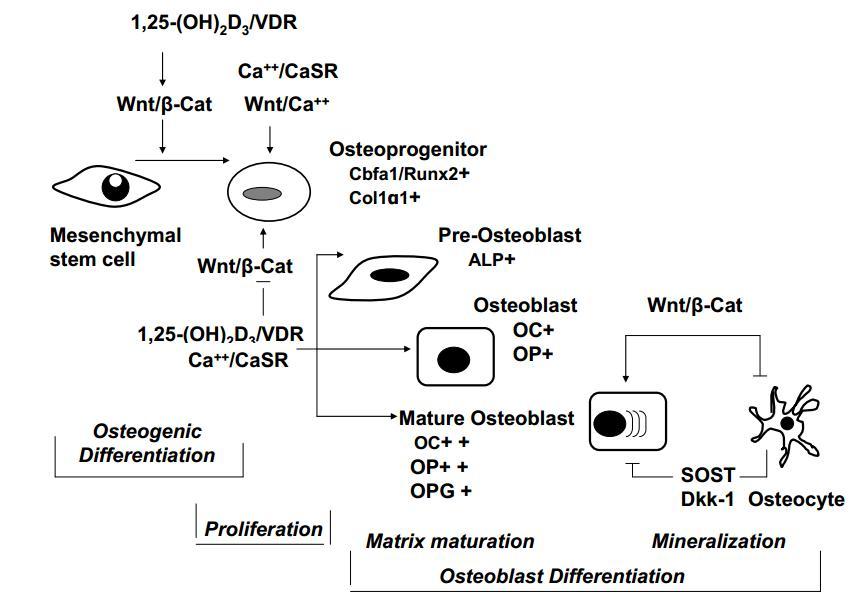 The concept of an important role of the CaSR in regulation of bone formation and mineralization as developed earlier [112,120], is fully supported by recent findings from a study in a CaSR knock-out mouse model [115]. As osteoblastic lineage cells are endowed with a functional CaSR (e.g., [121-123]), changes in [Ca ]o can be directly transduced into control of osteoblast proliferation, differentiation and function during any phase of mineralized bone formation (Figure 2). This process, in which the canonical Wnt/p-catenin signaling cascade plays a key role, [124] is coordinated by separate receptor-mediated effects of [Ca ]o and 1,25-dihydroxyvitamin d3 (1,25-(OH)2D3) [112,115,125]: As illustrated in Figure 2, activation of the Wnt/p-catenin pathway initiates "osteogenic differentiation" of pluripotent mesenchymal stem cells into osteoprogenitor cells, which characteristically express the osteoblast-specific transcription factor, Core-binding factor-1 (Cbfa1). Signaling from the CaSR in conjunction with the non-canonical Wnt5a/Ca pathway [126] increases the expression of Cbfa. This causes osteoprogenitor cells to proliferate and to produce collagen [122]. Subsequently, signaling from 1,25(OH)2D3/VDR inhibits proliferation and matrix deposition and at the same time promotes osteoblast differentiation through phases of matrix maturation and mineralization [127]. Independent of vitamin d, activation of the CaSR increases the expression of osteoblast-specific differentiation markers, such as alkaline phosphatase (ALP), osteocalcin (OC) and osteopontin (OP). Finally, the CaSR plays an important role in orderly bone formation by regulating crystal growth and by preventing excessive mineralization [112].