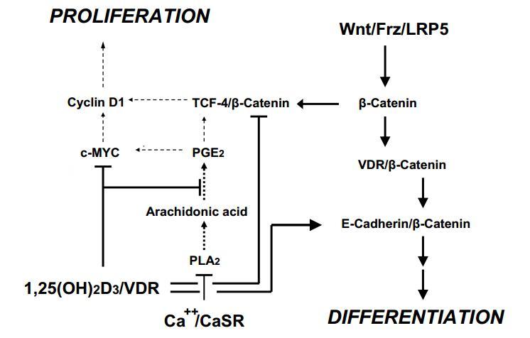 Cooperative signaling from Ca2+/CaSR and 1,25-(OH)2D3/VDR on Wnt pathways inhibits proliferation and promotes differentiation of colonocytes and of colorectal cancer cells.