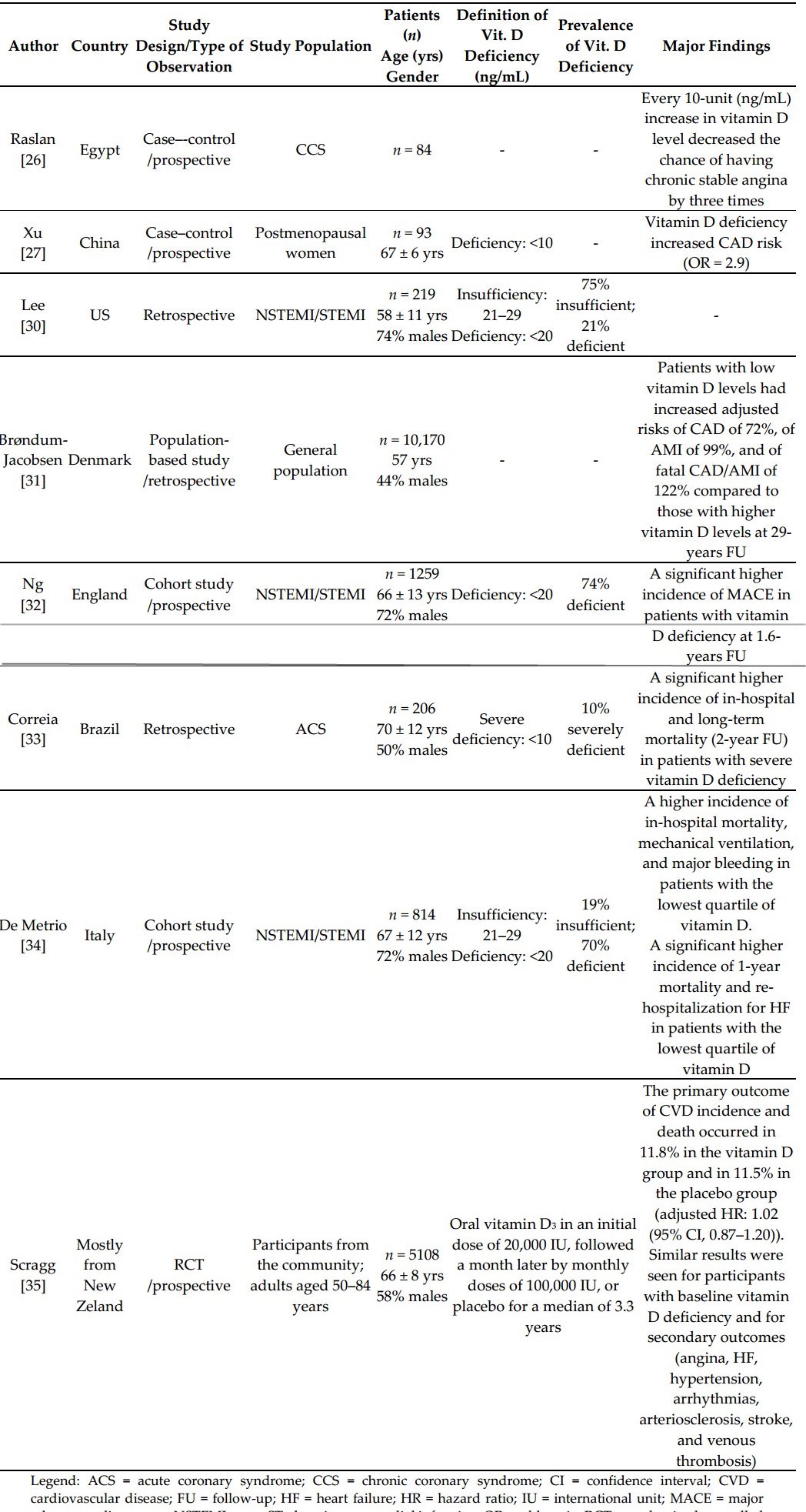 - The likelihood of unfavorable cardiovascular outcomes, especially major adverse cardiovascular event (MACE), new MI, and all-cause mortality among deficient vitamin D patient is poorly understood.