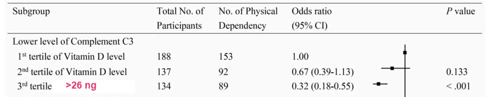 Results: Among 943 participants, 672 (71.3%) had physical dependence (PD). After adjusting for potential confounders, serum 25(OH)D and C3 levels were positively correlated with PADLs, while C4 levels were negatively correlated with PADLs (Ps < 0.05). Serum 25(OH)D levels significantly interacted with both C3 (P for interaction = 0.033) and C4 (P for interaction = 0.006) levels on PADLs. At lower complement component levels, the multivariate odds ratios (ORs) of the upper tertile of vitamin D for PD were 0.32 (95% CI: 0.18-0.55) in the C3 group and 0.29 (95% CI: 0.16-0.50) in the C4 group. At higher complement component levels, the ORs in the C3 and C4 groups were not statistically significant.