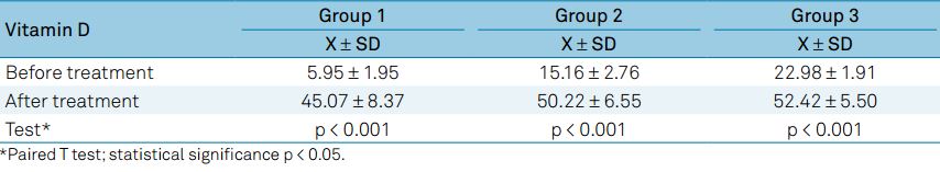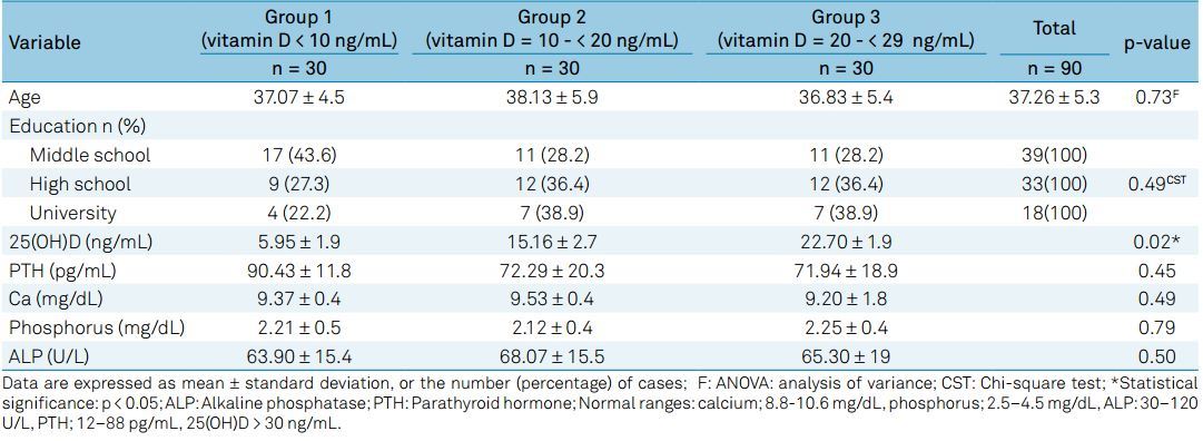 Methods: Ninety female patients, 25-45 years of age, who attended our outpatient clinic and had 25(OH)D levels < 30 ng/mL, were included. The Montreal Cognitive Assessment (MoCA) scale was used to determine cognitive functioning; the scale is divided into seven subgroups. Patients were divided into three subgroups according to their 25(OH)D levels. After a three-month period of 25(OH) D replacement, the patients underwent a re-evaluation using the MoCA scale.