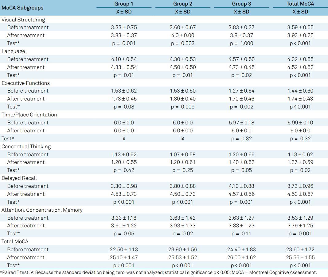 Results: The total MoCA score before treatment was significantly different from the score after treatment (p < 0.05). Language and delayed recall functions were significantly different before and after treatment (p < 0.05).