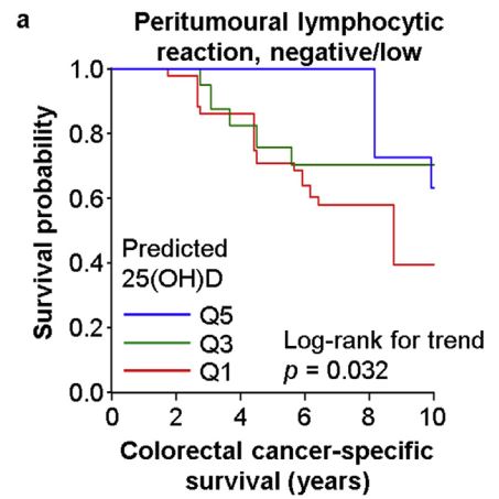 The association of postdiagnosis 25(OH)D score with colorectal cancer-specific mortality differed by levels of peritumoural lymphocytic reaction (pinteraction = 0.001). Multivariable-adjusted mortality hazard ratios for a quintile-unit increase of 25(OH)D score were 0.69 [95% confidence interval (CI), 0.54–0.89] in cases with negative/low peritumoural lymphocytic reaction, 1.08 (95% CI, 0.93–1.26) in cases with intermediate peritumoural reaction and 1.25 (95% CI, 0.75–2.09) in cases with high peritumoural reaction. The survival association of the 25(OH)D score did not significantly differ by Crohn's-like lymphoid reaction, intratumoural periglandular reaction or tumour-infiltrating lymphocytes.