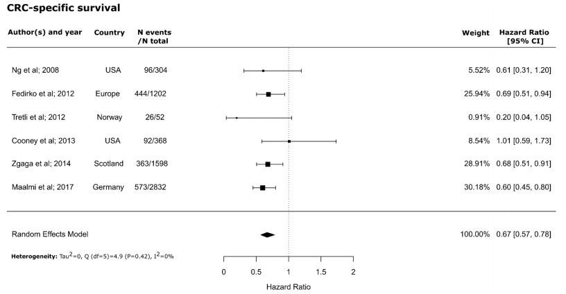 Overall, 11 original studies with a total of 7718 CRC patients were included. The dose-response meta-analysis showed an improvement in survival outcomes with increasing blood 25(OH)D concentrations. Pooled hazard ratios (95% confidence intervals) comparing highest versus lowest categories were 0.68 (0.55⁻0.85) and 0.67 (0.57⁻0.78) for overall and CRC-specific survival, respectively. Associations were more prominent among studies conducted in Europe, with larger sample sizes, and including stage I⁻IV patients. This updated meta-analysis reveals robust evidence of an association between higher blood 25(OH)D concentrations and better survival in CRC patients. The potential for enhancing prognosis of CRC patients by vitamin D supplementation should be explored by randomized trials.Colorectal cancer is associated with Vitamin D (17 meta-analyses so far) – July 2018Printer Friendly Follow this page for updates7937 visitors, last modified 11 Mar, 2021, This page is in the following categories (# of items in each category)Attached files