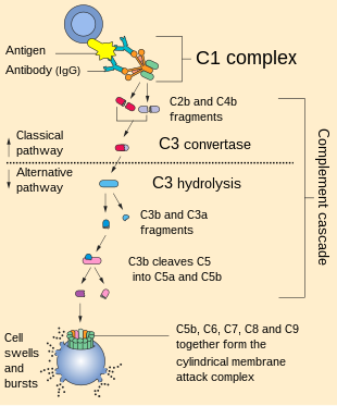 The complement system, also known as complement cascade, is a part of the immune system that enhances (complements) the ability of antibodies and phagocytic cells to clear microbes and damaged cells from an organism, promote inflammation, and attack the pathogen's cell membrane. It is part of the innate immune system,[1] which is not adaptable and does not change during an individual's lifetime.