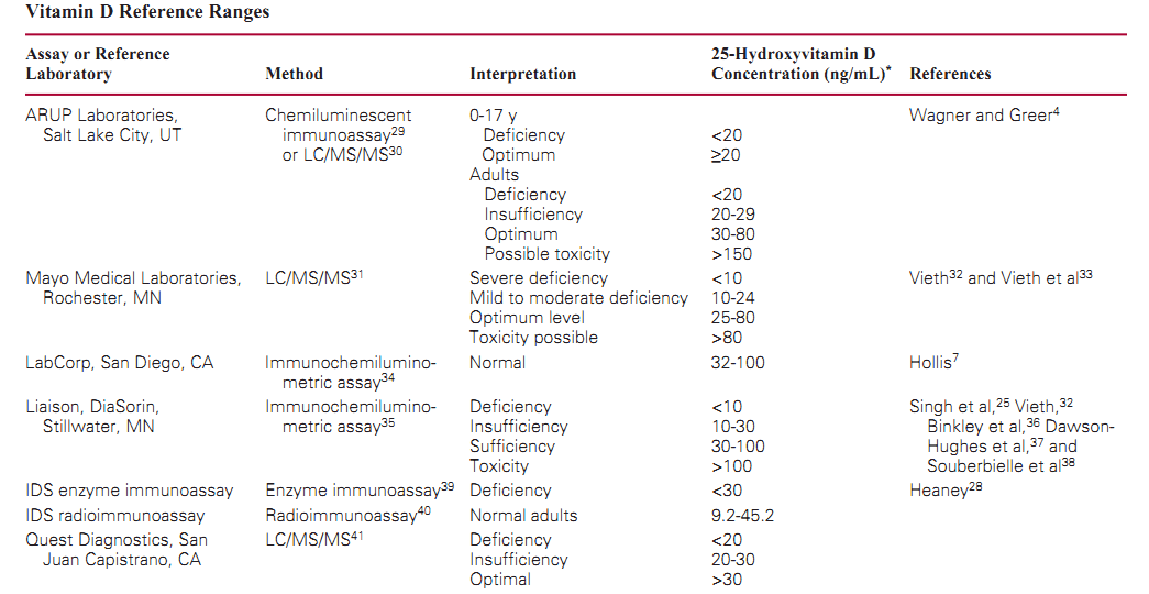 The lack of consensus on 25-hydroxyvitamin D target ranges results in substantial variation in the reference ranges or target values used by reference laboratories and manufacturers of 25-hydroxyvitamin D assays. Table 1 lists the ranges for 4 large reference laboratories in the United States and for 3 marketed immunoassays. Some of the ranges in Table 1 include a toxic concentration threshold that varies from 80 to 180 ng/mL (50-450 nmol/L). Combined with analytic variability in 25-hydroxyvitamin D concentrations across different laboratories and methods (discussed later), the lack of consistency of reference ranges makes it challenging for clinicians to assess multiple 25-hydroxyvitamin D concentrations for a given patient if performed at different laboratories. For example, a 25-hydroxyvitamin serum or plasma concentration of 26 ng/mL (65 nmol/L) could be interpreted as in the lower end of the "optimum" range in one laboratory but could result in the "insufficiency" range for another laboratory. The variety of Table 1 does not include reference ranges used by individual clinical laboratories that have developed their own method (eg, HPLC or LC/MS/MS) and set a reference range based on published literature or some other approach.
