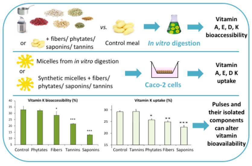 Adequate intakes of fat-soluble vitamins (A, D, E, K) are essential for both organism development and healthy aging. The term “vitamin D” refers to a group of molecules belonging to the steroid family like cholesterol. Vitamin D3, which is the main dietary form of vitamin D, can either be found in small amounts in foods such as fatty fish and supplemented dairies, or synthesized by the skin under sun exposure (Reboul, 2015). “Vitamin K” refers to both vitamin K1 (phylloquinone) and K2 (menaquinones), which belong to the terpenoid family. Vitamin K is mainly provided through the diet via green leafy vegetables and some fermented products (Shearer, 1992). Both vitamin D and K play key roles in bone metabolism (Ahmadieh and Arabi, 2011, Devine et al., 2002) and decrease the risk of cardiovascular diseases (Tsugawa, 2015). Moreover, vitamin D participates in inhibiting cancerous cell growth (Kawa et al., 1997, Mantell et al., 2000) and vitamin K is involved in hemostasis by activating blood-clotting proteins (Nelsestuen, Zytkovicz, & Howard, 1974).Improving the sustainability of our diets has become a priority during the past decades. In this context, increasing pulse consumption may be interesting as pulses present both environmental and nutritional benefits. Indeed, pulses are able to restore soils in nitrogen (Gan et al., 2015) and they present high contents in proteins, fibers and minerals (Margier et al., 2018). However, pulses also contain fairly high amounts of bioactive compounds such as phytates, saponins and tannins (Margier et al., 2018) that can interfere with the transfer of fat-soluble vitamin (including vitamin D3 and K1) to mixed micelles during in vitro digestion or with fat-soluble vitamin uptake by cultured intestinal cells (Antoine et al., 2021, Margier et al., 2019).