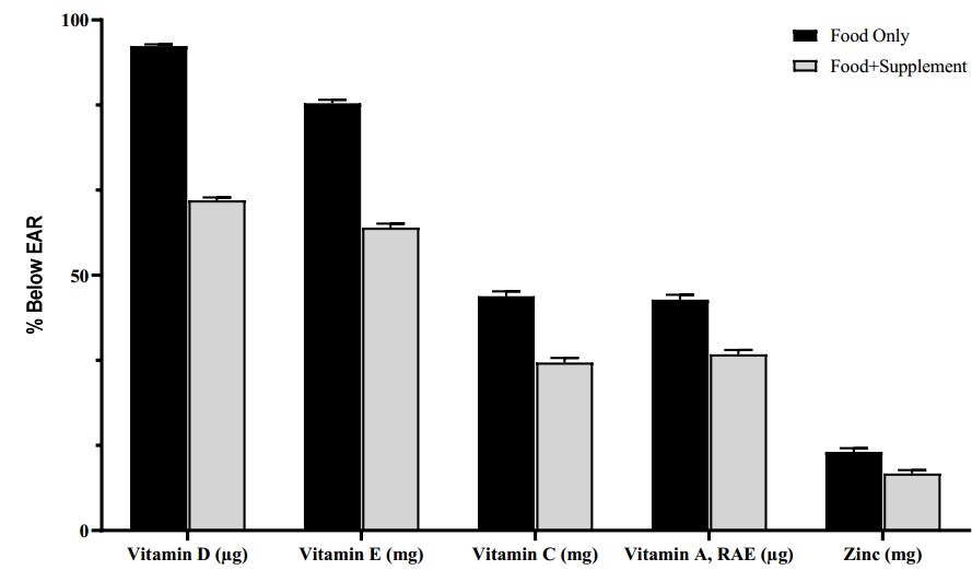 Our research shows that food plus a dietary supplement had a lower prevalence of nutrient inadequacies than food alone. The percentage of the population with usual intakes below the EAR in adults (> 19 years) from food only vs. food + dietary supplements for vitamin A (45 to 35%), vitamin C (46 to 33%), vitamin D (95 to 65%), vitamin E (84 to 60%), and zinc (15 to 11%) (Figure 1).