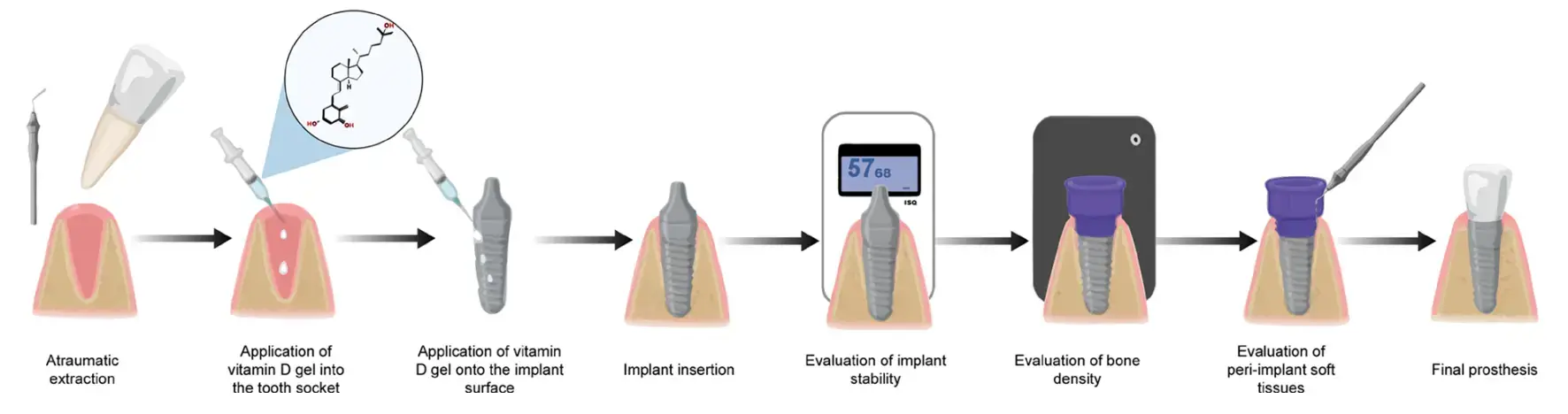 The reductions in peri-implant probing depth and bleeding index reflected improved soft tissue healing. The decrease in postoperative pain scores suggested potential analgesic effects. The increase in implant stability and bone density indicated enhanced osseointegration. These findings support the clinical application of topical vitamin D3 for immediate dental implant placement to promote peri-implant soft and hard tissue healing.