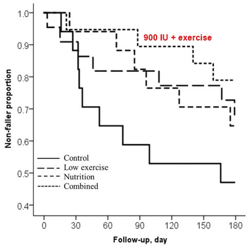 A two-way analysis of variance including interactions between experimental group and time indicated a clear benefit in the groups that received supplementation with vitamin D. A Cox proportional-hazard regression analysis, adjusted for sex and age, showed that compared to the control group, the combined group had a reduced risk of falls (hazard ratio: 0.28, 95% CI: 0.08–0.92, P < 0.05). The other groups did not significantly differ from controls.