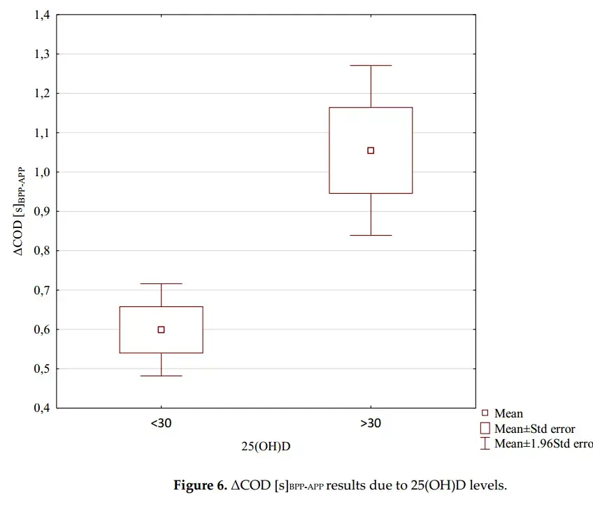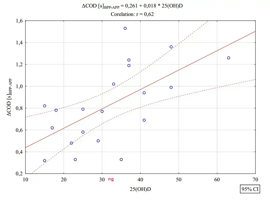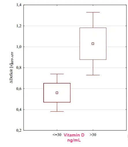 Significant differences were noticed for the ACOD (m=0.60 [s]) and Adeficit (m=0.56s) in the soccer players whose 25(OH)D concentration was <=30 ng/ml, and for the ACOD (p=0.002) and Adeficit (p=0.017) in the soccer players whose 25(OH)D concentration was >30 ng/ml. The training effect was significantly higher for the soccer players whose 25(OH)D concentration was above 30 ng/ml. Soccer players whose serum 25(OH)D concentrations were >30 ng/ml achieved better results in the applied tests.