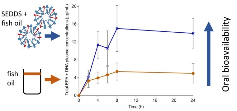 - “Results showed that combining the omega-3 EE with SMEDS caused instant and complete emulsification on addition to water, while the control fish oil did not emulsify. In subjects, the group taking fish oil with SMEDS experienced a 3.7 and 7.1-fold increase in omega-3 maximum plasma concentration and absorption, respectively, compared to placebo.”