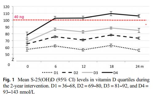 | Vitamin D response nmol/L | 59.5 | 74.7 | 86.0 | 105.9 (42 ng) |