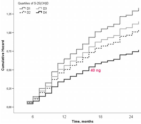 There were 37% fewer falls in the highest quartile, while the two middle quartiles did not differ from reference. The respective IRRs (95% CI) for falls were 0.63 (0.44 to 0.90), 0.78 (0.55 to 1.10), and 0.87 (0.62 to 1.22), indicating lower falls incidence with increasing mean S-25(OH)D levels. There were 42% fewer fallers (HR 0.58; 040 to 0.83) in the highest quartile compared to reference. Physical functioning did not differ between quartiles.