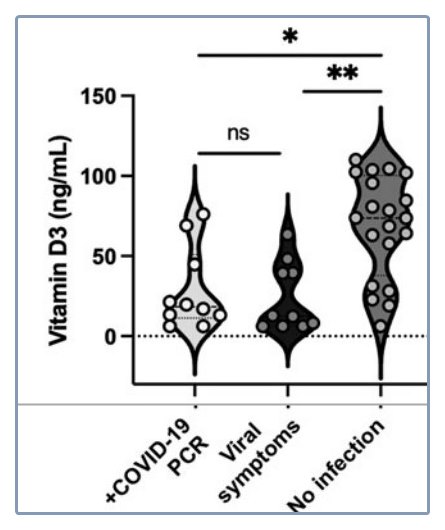 Results: Vitamin D3 concentration in human milk was higher in women without infection than in women with viral symptoms or COVID-19 PCR. Interleukin-2 level in milk was higher in the no-infection group than the COVID-19 PCR group but it did not differ with the viral symptoms group. Vitamin D3 did not correlate with any cytokines in human milk. Prenatal vitamin intake did not affect the vitamin D3 in human milk. The percentage of milk from mothers with <20 ng/mL of vitamin D3 was 50% in the COVID-19 PCR group, 60% in the viral symptoms group, and 5% in the no-infection group.