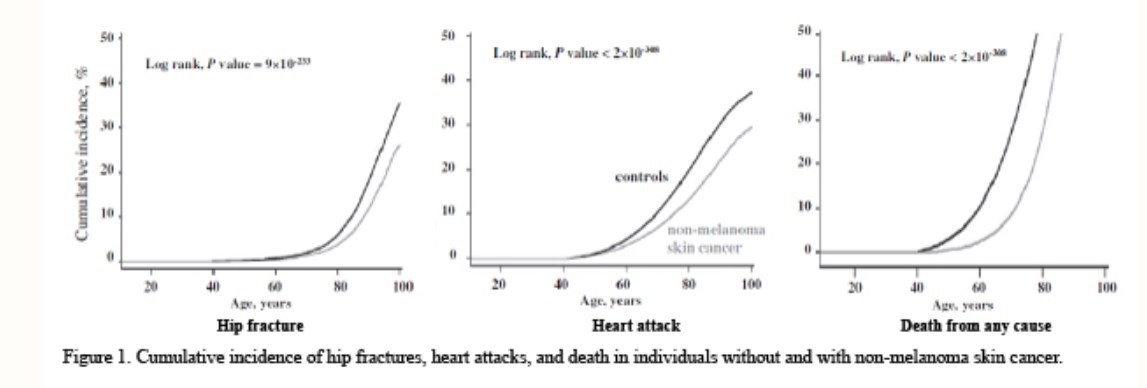Skin cancer as a marker of sun exposure associates with myocardial infarction, hip fracture and death from any cause.