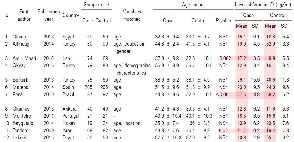 Review of the primary studies selected for meta-analysis showed that most of them found lower levels of vitamin D among FM patients than the control groups. But, four studies indicated that these patients had higher levels of vitamin D than healthy individuals. However, pooled estimates showed that FM patients in comparison with the control groups had, on average, 0.56 units lower concentration of vitamin D. Most of these studies compared age-matched cases/controls and half of these studies investigated only women in the premenopausal stage.