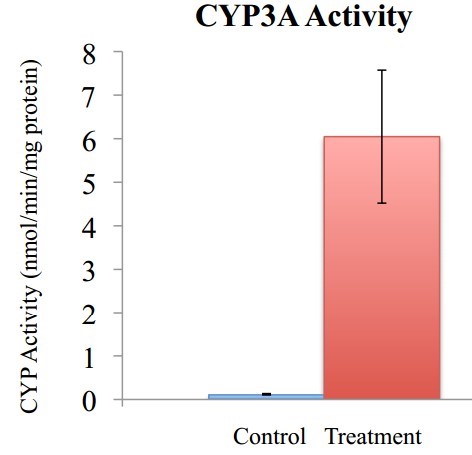 Vitamin D deficiency in the Unites States has become more prevalent in recent years. Research has shown that environmental chemicals such as flame-retardants induce hepatic enzymes in the cytochrome P450 family such as CYP24 and CYP3A that are important in vitamin D metabolism. To determine if exposure to one class of flame- retardants known as polybrominated diethyl ethers (PBDEs) promotes vitamin D deficiency, 15 rats consumed a diet marginally deficient in Vitamin D - 85 IU Vitamin D/kg diet - for 56 days. On day 28 of the experiment, 7 rats were gavaged daily with 7 mg/kg BW PBDEs and 8 rats were gavaged daily with corn oil, for 28 days. Body weight and food intake were measured three times a week, vitamin D status markers in the urine were measured at weeks 4 and 8 and blood Vitamin D metabolites along with liver weight were measured at euthanization. Liver microsomal vitamin D metabolism, composition and CYP3A enzyme activity were also measured. The final body weight tended to be lower in the treatment animals than in the control but was not significantly different (370.29±40.12 vs. 400.63±31.99, respectively, p = 0.0636). Liver from PBDE- treated rats was significantly heavier than liver from control rats (15.67±1.99 vs. 12.71±0.98, respectively) p < 0.05. Liver as a percent of body weight was also significantly greater in treatment (4.24±0.2) compared to control (3.18±0.13). There was no significant difference in the lipid composition of the liver or urine metabolites between PBDE-treated and control rats. The inactive metabolites 24, 25-dihydroxy vitamin D3 and 4p, 25-dihydroxy vitamin D3 did not show significant difference between control and treatment groups. The active form of 1, 25-vitamin D3 tended to be lower in the PBDE-treated rats than in the control (0.071±0.027 vs. 0.082±0.018, respectively, p = 0.187). When expressed as a ratio to 25(OH)D3, 4p, 25-dihydroxyD3 was significantly lower in treatment rats compared to control (0.96±0.18 vs. 1.28±0.38, respectively) and 1 25-dihydroxyD3 tended to be lower in treatment compared to control (3.62±0.96 vs. 4.44±0.97, p = 0.068). Enzymatic CYP3A levels were significantly higher in PDBE- treated rats than in control (6.047±1.53 vs. 0.103±0.032 nmol/min/mg protein, respectively). The hypothesis that the induction of CYP3A by PBDEs may accelerate vitamin D inactivation, leading to vitamin D deficiency was not supported by the findings, as there was no significant change in serum vitamin D levels in the PBDE- treated rats.
