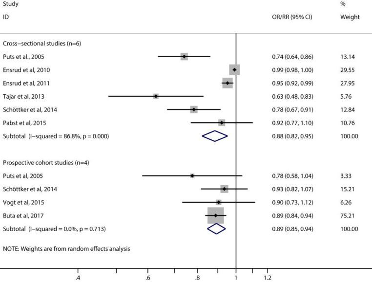 The pooled risk estimate of frailty syndrome per 25 nmol/L increment in serum 25OHD concentration was 0.88 (95% CI = 0.82-0.95, I2 = 86.8%) in the 6 cross-sectional studies and 0.89 (95% CI = 0.85-0.94, I2 = 0.0%) in the 4 prospective cohort studies. Based on the Akaike information criteria (AIC), a linear model was selected (AIC for the nonlinear model: - 5.4, AIC for the linear model: - 6.8 in the prospective cohort studies; AIC for the linear model: - 13.6, AIC for the nonlinear model: - 1.77 in the cross-sectional studies).