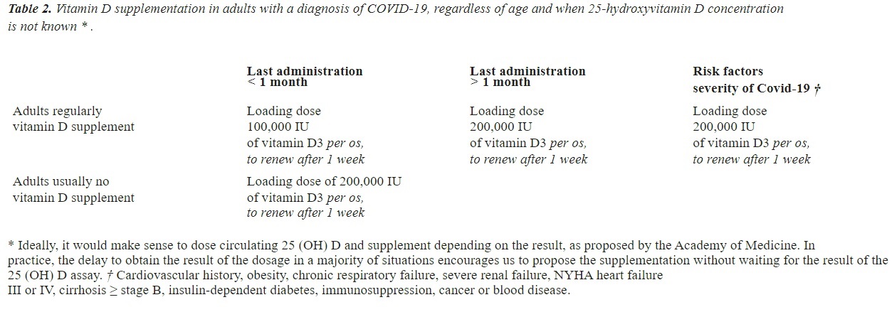 After 12 months of viral circulation, the SARS-CoV-2 has infected millions of people around the world, leaving hundreds of thousands dead. With the lack of effective therapy and vaccination against COVID-19, focusing on the immediate repurposing of existing drugs gives hope of curbing the pandemic. Vitamin D is a possible candidate discussed in a high amount of publications. Randomized clinical trials show that vitamin D supplementation significantly reduces the risk of respiratory infections. There are also many evidences that hypovitaminosis D is an independent (and easily modifiable) risk factor for severe forms of COVID-19 and death. Vitamin D supplementation is a simple, safe and inexpensive measure, which is effective in correcting hypovitaminosis D found in 40-50% of the French population and in more than 80% of adults with COVID-19. In this position paper, we propose simple regimens (adapted to the pharmaceutical forms currently available in France) for vitamin D supplementation in adults with or without COVID-19.