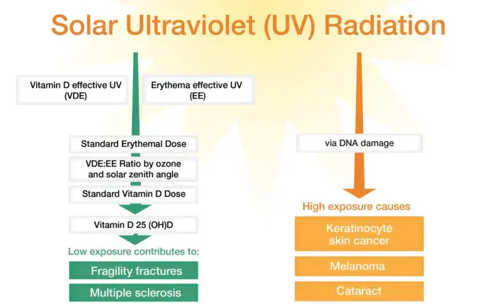 The expected healthcare costs from over-exposure to UV radiation were AU$12.4 billion in Australia and NZ$5.2 billion in New Zealand, three-fold higher than costs for conditions attributable to under-exposure in both countries. Despite the enormous burden of skin cancers, highlighting the importance of sun protection, avoidable deaths and healthcare costs of fragility fractures due to a lack of UV radiation requires a reduction in vitamin D deficiency in Australians and New Zealanders.