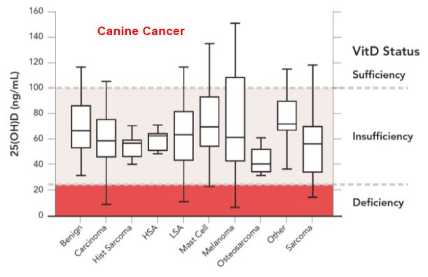 - Dog Cancer (hemangiosarcoma) is rare if more than 100 ng of vitamin D – July 2014