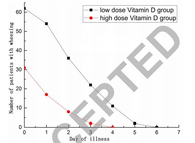 Of 121 cases in total, 78 and 43 cases of influenza A infection occurred in the low-dose and high-dose vitamin D groups, respectively. There was a significant difference between the groups (χ = 14.6324, P = 0.0001). Among the cases of influenza infection, the median durations for fever, cough, and wheezing were shorter in the high-dose vitamin D group than in the low-dose vitamin D group. The viral loads showed a downward trend in both groups, and were significantly different between the groups at the second and third detections. Additionally, the incidences of adverse events and severe adverse events were very low and not significantly different between the two groups.