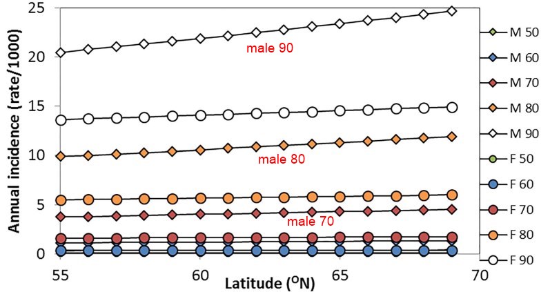 In men, MI-related death incidence increased by 1.3% [95% confidence interval (CI) = 1.1-1.5] per degree of latitude (northwards).