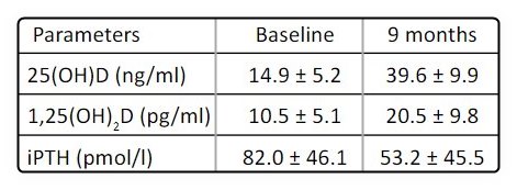 Results: We could recruit a cohort of 23 patients. Blood levels of 25(OH)D increased significantly in 82.6% of the patients to above 30 ng/ml. A similar effect was observed with 1, 25(OH)2D levels. iPTH levels decreased significantly when levels of 25(OH)D exceeded 30ng/ml at the end of the nine months. Vitamin D serum levels were typically measured immediately before the next monthly dose was administered. Blood levels of calcium, phosphorus, and alkaline phosphatase were stable during the study period. No events of hypercalcemia were reported, and no patient discontinued the monthly VD3 supplementation.