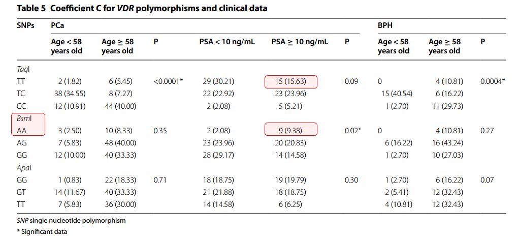Statistical analysis showed a noteworthy correlation among SNPs and clinical pathological features. CC genotype (TaqI) was correlated with the age at diagnosis (>58 years old), and GG (BsmI) was associated to lower Prostate-Specific Antigen (PSA) levels (<10 ng/mL). Moreover, when PCa patients were subgrouped, G allele (BsmI) significantly increased the estimated chance for PSA < 10 ng/mL, and GG/GG genotype (BsmI/ApaI) provided a 9.75 fold increased chance of patients with PCa to present lower PSA levels.