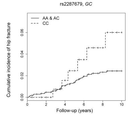 RESULTS: Multivariate linear regression analyses showed that rs2282679 in GC (the gene encoding group-specific component (vitamin D binding protein)) locus was significantly associated with lower serum 25(OH)D concentration (P = 8.1 × 10⁻⁵). A Cox proportional hazards model indicated that rs2282679 in GC was significantly associated with the occurrence of hip fracture in a recessive model (hazard ratio (95% confidence interval) = 2.52 (1.05-6.05), P = 0.039).