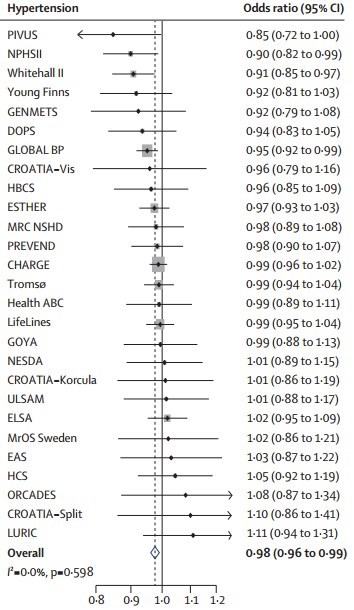 8.1% decrease in the odds of developing hypertension. - NHS (UK) has a good overview of the study and its implications - the following are a few sentences from the article
