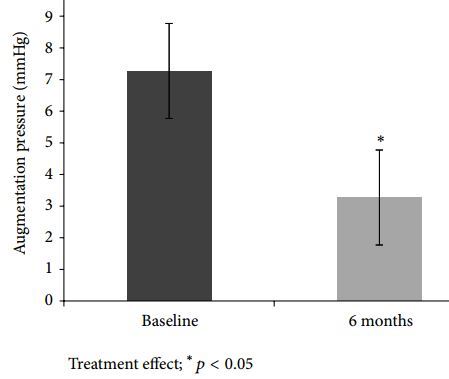 Results. There were no changes in resting BP or pulse wave velocity over 6 mo regardless of vitamin D dose (all p > 0.202). High-dose vitamin D decreased augmentation index and pressure by 12.3 ± 5.3% (p = 0.047) and 4.0 ± 1.5 mmHg (p = 0.02), respectively. However, these decreases in arterial stiffness were not associated with increases in serum 25-hydroxyvitamin D over 6 mo (p = 0.425).