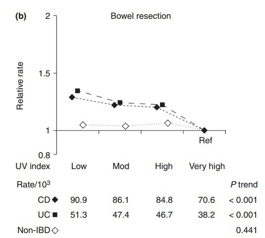 Among IBD patients, lower UV exposures had increased hospitalisation rates for CD (217.8 vs. 182.5 per 100 000 overall hospitalisations with low and very high UV, respectively; P trend <0.001) and UC (123.2 vs. 113.8 per 100 000; P trend = 0.033). Low UV groups had greater relative rates of prolonged hospitalisations [CD: 1.13, 95% confidence interval (CI) 1.07-1.19; UC: 1.21, 95% CI 1.13-1.30], bowel surgeries (CD: 1.24, 95% CI 1.16-1.32; UC: 1.21, 95% CI 1.09-1.33), and CD deaths (CD: 1.76, 95% CI 1.14-2.71; UC: 1.24, 95% CI 0.92-1.67). Among non-IBD patients, low UV was associated with prolonged hospitalisations (1.09; 95% CI 1.07-1.11) and deaths (1.13; 95% CI 1.09-1.17), but not bowel surgeries (1.01; 95% CI 0.99-1.03).