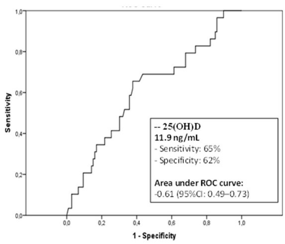The area under the ROC curve for 25(OH)D levels at admission in relation to mortality was 0.61 (95%CI 0.49-0.73), similar to those for APACHE II (0.7, 95% CI 0.59-0.8) and SOFA scores (0.7, 95% CI 0.6-0.8). The best cutoff was 11.9 ng/mL, with a sensitivity of 65%, a specificity of 62%, a negative predictive value of 86.8%, and a positive predictive value of 32.2% (Figure 1).