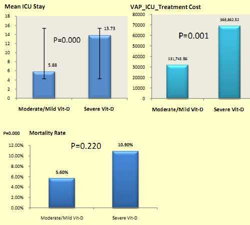 Of the 191 patients, 129 (67.5%) were male, and 62 (32.5%) were female, 118 (61.8%) were African-Americans and 73 (38.2 %) were Caucasian. 62.3% were severe vitamin D deficiency, 29.3% moderate deficiency, and 6.8% mild deficiency. The incidence of VAP in the severe group was 30.3% versus 16 % in the non-severe (moderately & mildly deficiency) group (p value, 0.040). Mean LOS in the SICU for severely deficient group was 13.7 days versus 5.9 days. Average ICU cost was $68,862.52 for severe group with VAP versus $31,743.56 (p value, 0.001). Mortality rate for the severe vitamin D deficient group with VAP was 10.9% versus 5.6%, (p value, 0.220), a trend towards higher mortality.