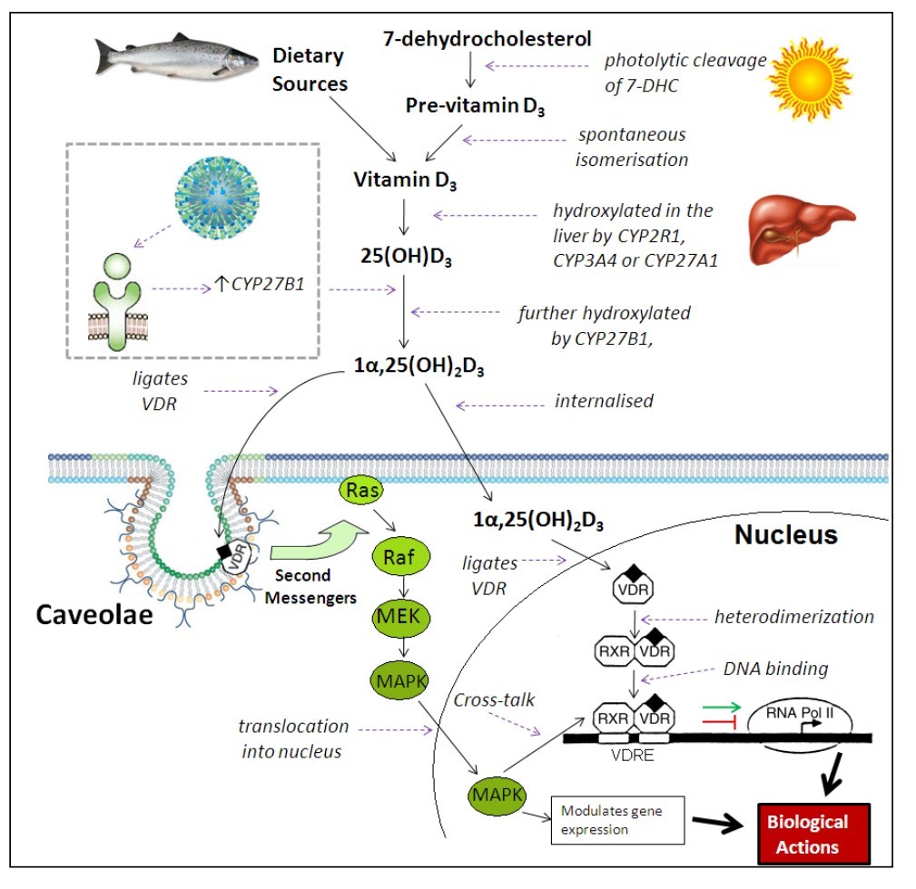 Figure 2. Metabolism of 1a,25(OH)2D3. Vitamin D3 is either obtained from dietary sources or UV synthesis, before two hydroxylations occur to produce the active metabolite 1a,25(OH)2D3. TLR ligation can also increase levels of CYP27B1, resulting in enhanced 1a-hydroxylation of 25(OH)D3. The 1a,25(OH)2D3 then binds to nuclear or membrane vitamin D receptors (VDRs). Nuclear VDR ligation results in heterodimerization with retinoid X receptor (RXR) and binding to vitamin D responsive elements (VDRE) in promoter regions of responsive genes. Components of the RNA polymerase II complex are then recruited for induction of gene transcription, or transcription is repressed. Membrane caveolae-associated VDR ligation results in the activation of second messenger systems, with one effect being the initiation of Ras/MAPK signal transduction. Nuclear MAPK modulates gene expression and engages in cross-talk with the VDR-RXR-VDRE complex. (Adapted from Slatopolsky et al. [104], and Parton and Simons [105]).Effects of Vitamin D on the Innate Immune Response to Respiratory Pathogens