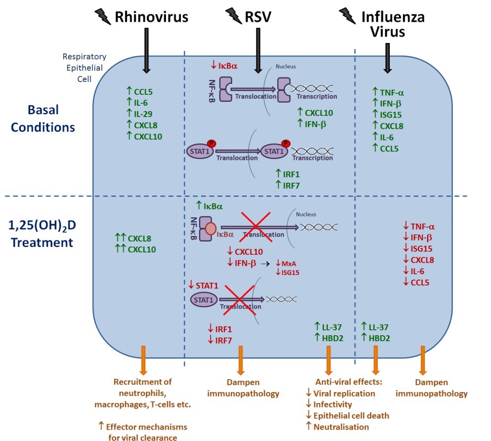 RSV is usually associated with illness in young children, with most infants having been infected by the age of three, causing a mild URI for the majority, but severe bronchiolitis in some [179,180]. It has also been associated with a higher risk of developing asthma in later life [181]. Vitamin D deficiency has been linked to RSV susceptibility, with low cord blood plasma concentrations of 25(OH)D related to RSV incidence in the first year of life [182], and single nucleotide polymorphisms (SNPs) in the VDR (rs10735810 and the Fokl SNP) and vitamin D binding protein (the GC1s variant) associated with a genetic predisposition to RSV bronchiolitis [183-186]. However, as with rhinovirus, in vitro work investigating the specific effects of vitamin D on the immune response to RSV is limited.In a study using primary human tracheobronchial epithelial (hTBE) cells treated with 1,25(OH)2D, expression of the NF-kB inhibitor IKBa was upregulated [187]. Cells infected with RSV for 24 h had decreased protein levels of IKBa, due to RSV-induced degradation, but in cells pre-treated with 1,25(OH)2D prior to RSV infection IKBa levels were increased due to augmented mRNA transcription and protein synthesis. An increase in IKBa results in NF-kB remaining inactive in the cytoplasm, preventing its translocation into the nucleus and subsequent binding to DNA promoter regions. Thus, vitamin D inhibits RSV induction of NF-KB-driven IFN-P and CXCL10 secretion, as also demonstrated in this study. Additionally, interferon stimulated genes (ISGs) without functional NF-kB sites in their promoters were also measured, with 1,25(OH)2D treatment resulting in decreased levels of human myxovirus resistance protein 1 (MxA) and ISG15. This was demonstrated to be a consequence of the suppression of NF-KB-driven IFN-P production. Similarly, pre-treatment with 1,25(OH)2D before inoculation with RSV resulted in decreased levels of STAT1 protein and inhibition of STAT-1 translocation to the nucleus, also as a consequence of suppression of NF-KB-driven IFN-P production. However, even though production of important components in the antiviral response to RSV infection (IFN-P, CXCL10, STAT1, MxA and ISG15) were reduced by treatment with 1,25(OH)2D, viral replication and viral load was not increased. Thus, via increasing IKBa levels, 1,25(OH)2D is able to dampen the inflammatory response to RSV infection whilst maintaining the antiviral state and without having adverse effects on viral load, suggesting a potential role in reducing immunopathology. A similar study using alveolar A549 cells infected with RSV has also demonstrated that 1,25(OH)2D is able to decrease levels of phosphorylated STAT-1 (pSTAT-1) and increase iKBa protein levels, with subsequent diminished expression of interferon regulatory factor 1 (IRF1), IRF7, IFN-P and CXCL8 mRNA [188]. This study also used retroviral transduction to overexpress the common M4 VDR variant, or the Ml FokI VDR variant, which has been associated with severe RSV bronchiolitis. No differences were observed between the two variants in viral replication, or the vitamin D-induced increase in IKBa and repression of NF-KB-regulated genes. However, in Ml FokI VDR-expressing cells, vitamin D was not able to repress expression of the STAT-1 regulated genes IRF1 and IRF7, due to decreased regulation of STAT-1 phosphorylation. Therefore, together these studies indicate that vitamin D is able to dampen NF-kB and STAT-1 mediated inflammation to reduce RSV immunopathology, with an impairment in the regulation of STAT-1 phosphorylation resulting in more severe disease.